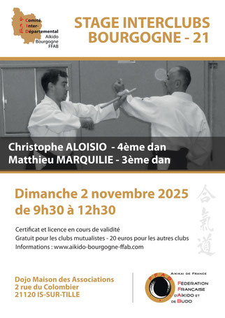 02 novembre 2025 [STAGE] Dimanche 02 Novembre 2025 : Stage ouvert à tous à Is sur Tille Dimanche 02 Novembre 2025 : Stage ouvert à tous à Is sur Tille encadré par Christophe Aloisio 4e Dan et Matthieu Marquilie 3e Dan. Connexion à Facebook tagPlaceholderCatégories : Aïkido, Stage, Débutants, Confirmés, Ouvert à tous, Pratique, CID Bourgogne